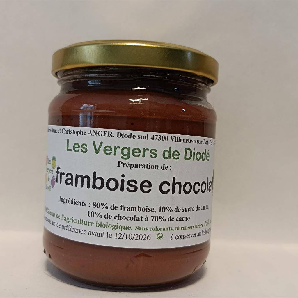 Ingrédients : 80% de framboise, 10% de sucre de canne, 10% de chocolat à 70% de cacao
