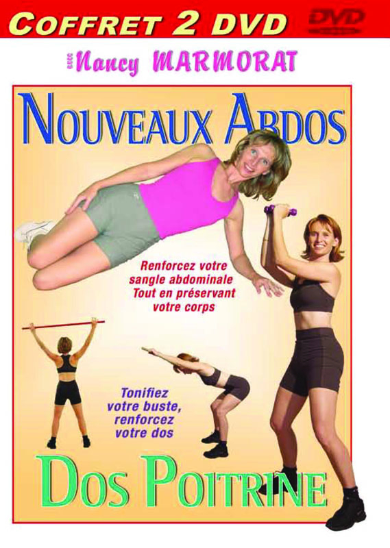 Coffret contenant les deux DVD : #Les nouveaux Abdos : Très souvent les abdominaux proposés pour sculter la taille et le ventre sont issu de la pratique sportive compétitive, s'ils sont efficaces pour des athlètes ou des danseuses ils peuvent être néfastes pour la majorité d'entre nous s'ils sont mal conduits. Un des pricipaux inconvénients, c'est qu'ils augmentent les pressions subies par les parois de l'abdomen et du périnée, partie du corps particulièrement fragile chez la femme. Dans ce nouveau programme spécifiquement adapté à la morphologie féminine, Nancy Marmorat vous propose une autre façon de travailler vos abdominaux, sans risque, plus respectueuse de votre corps et toue aussi bénéfique pour obtenir un ventre plat et une taille galbée. #Dos poitrine : Nancy Marmorat, professeur de danse, stretching et gym tonique a mis au point ce programme de remise ne forme pour entretenir et développer votre tonus musculaire. Cet entraînement est à pratiquer chez vous et à votre rythme. Sommaire : 1. Echauffement 2. Exercices de coordination 3. Renforcement musculaire spécifique 4. Stretching 5. Soulager votre dos