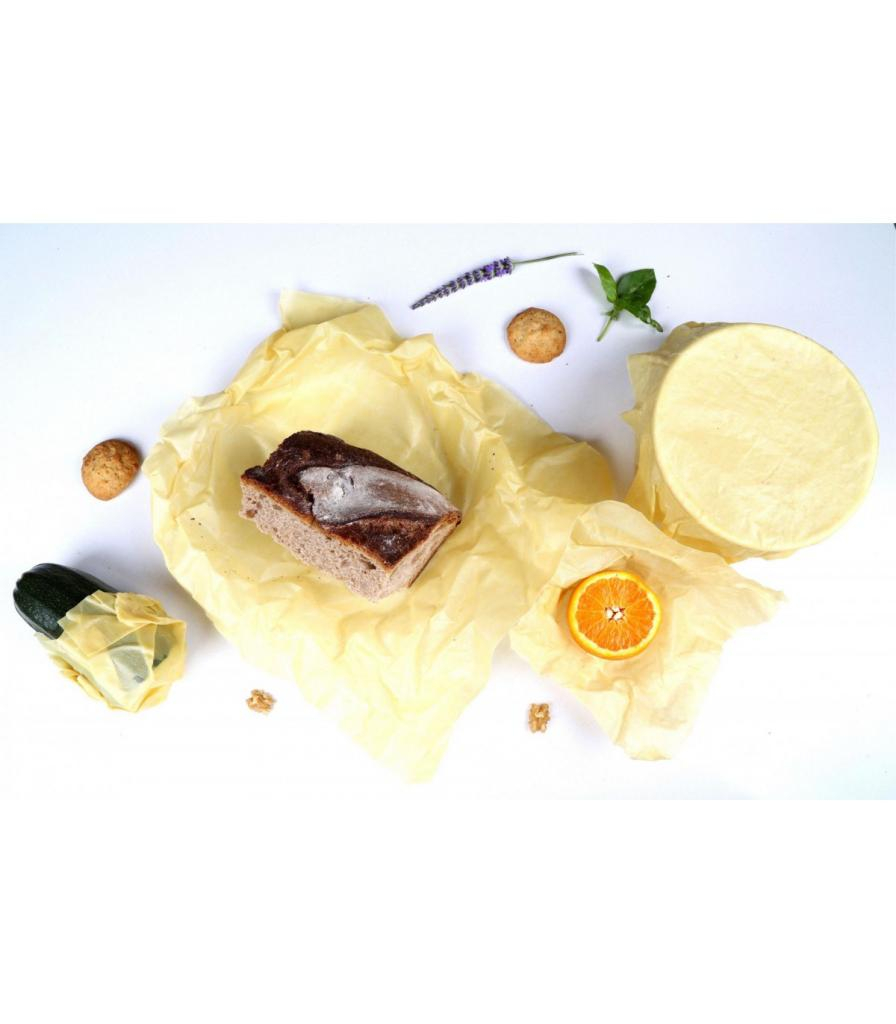 Cet emballage alimentaire est réutilisable. Ce tissu en coton bio est enduit de cire d'abeille Française, de résine de pin des Landes ainsi que d'huile de tournesol biologique.