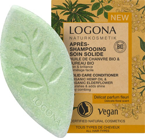 Après-shampoing solide au chanvre et sureau, un soin qui démêle les cheveux en douceur. Pain solide de 60g.
