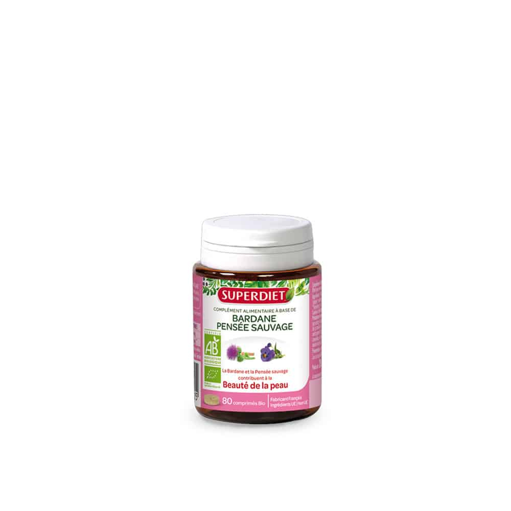 La Bardane et la Pensée Sauvage sont traditionnellement utilisées pour le maintien d’une peau nette. Les Laboratoires Superdiet ont réuni leur savoir faire dans la fabrication des comprimés bio pour vous offrir : une formule aux extraits et poudres de plantes ; des produits issus de l’Agriculture Biologique.