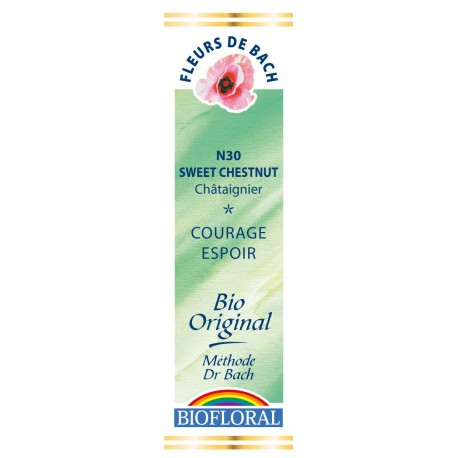 Humeur : découragement / désespoirNuméro fleur : 30Nom anglais : Sweet ChestnutEmotions/déséquilibre : pour les moments très difficiles de la vie, de désespoir extrêmeChangement positif : transformation et libération, retrouver la lumièreFlacon compte-gouttes de 20ml en étuiIngrédients 100% biologiques : cognac bio demeter, infusion aqueuse de castanea sativa 1/240èmeCertifié AB par EcocertClassification : complément alimentaire