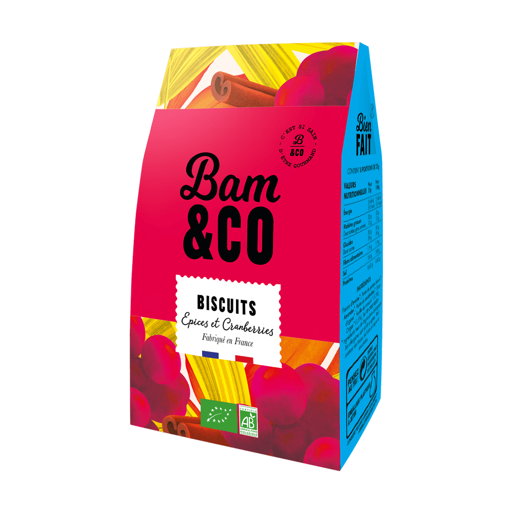 Les mini biscuits Épices et Cranberries BAM&Co se démarquent par leur goût et leur croquant. Avec de la farine complète et sans sucre raffiné, ils sont parfaits pour une pause gourmande et saine.