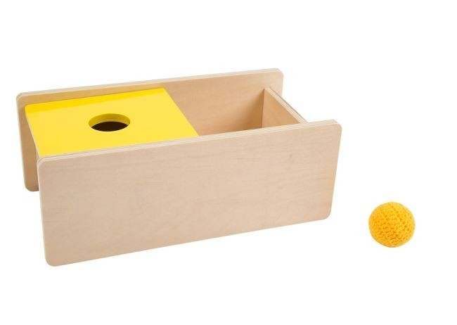 Boîte rectangulaire avec couvercle basculant et une balle jaune en tricot.