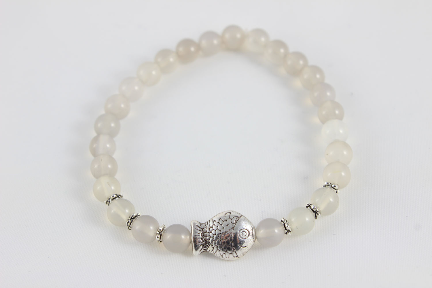 « Elément » est un bracelet en agate grise portant une breloque en forme de poisson. Le poisson est l’animal qui symbolise le mieux un des 4 éléments : l’eau. En grandissant toute sa vie et en gardant sans cesse les yeux ouverts, cet être nous apprend à s’éveiller à notre plein potentiel. L’agate apportera équilibre physique, émotionnel et spirituel, nécessaire pour se sentir dans notre élément.