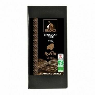 Tablette de chocolat noir Bio à 74% à base de cacao bio du Congo.