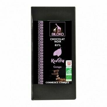 Tablette de chocolat noir Bio à 85% à base de cacao bio du Congo.