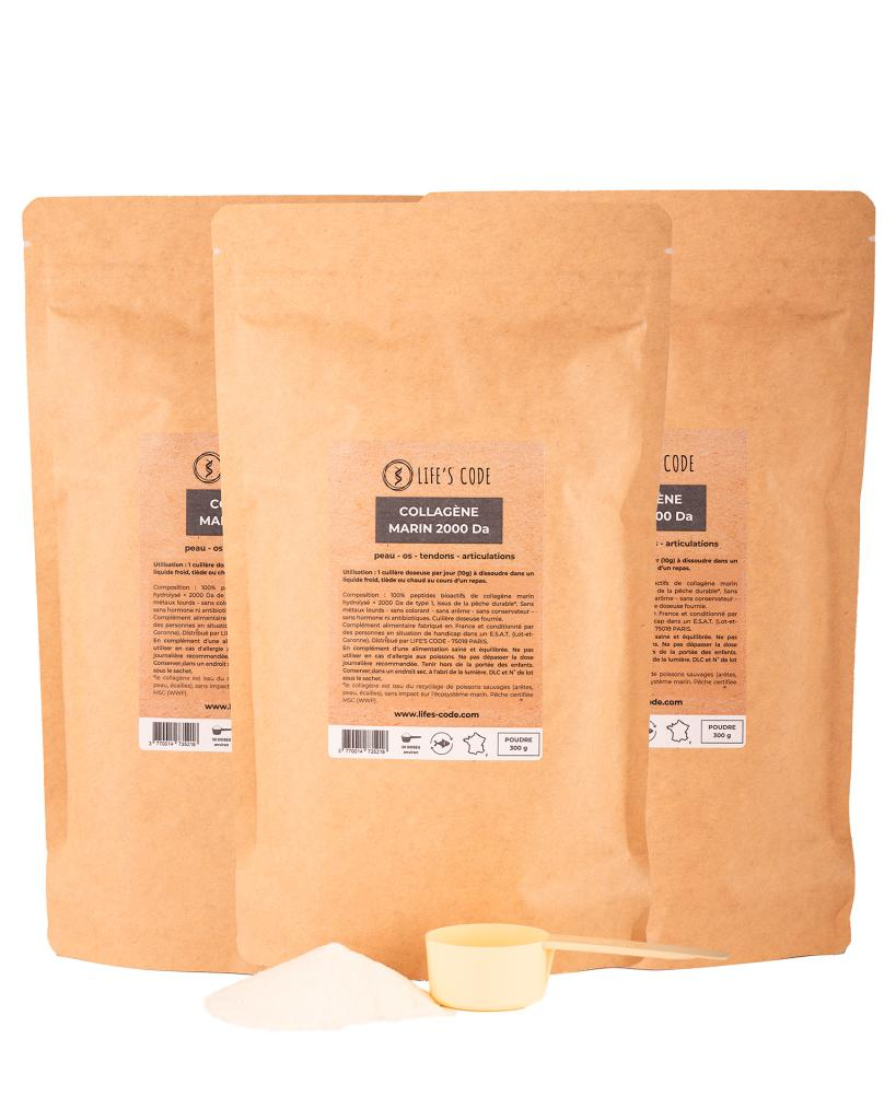 Le Collagène Marin Life's Code est fabriqué à partir du recyclage d'arêtes et d'écailles pour la valorisation de l'ensemble des parties du poisson. De plus, il est certifié MSC (Marine Stewardship Council - WWF), garantissant une pêche durable et respectueuse des écosystèmes marins. Nous nous engageons également à une fabrication éthique et responsable.