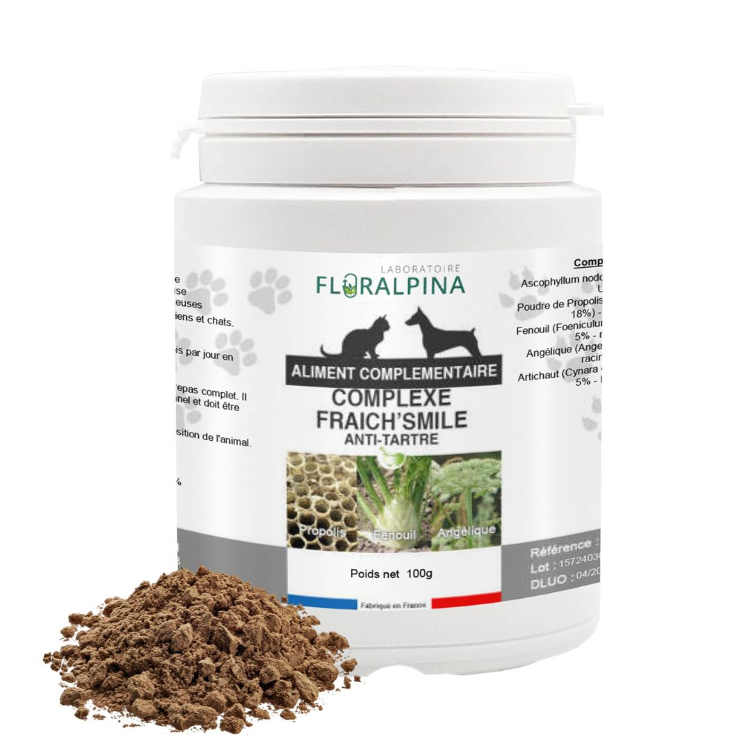 Chez VetoCompagnon, nous avons élaboré FRAICH'SMILE une solution qui aide, grâce à ses principes actifs, à dissoudre le tartre dentaire et ainsi, prévenir la mauvaise haleine de vos chiens et chats.
