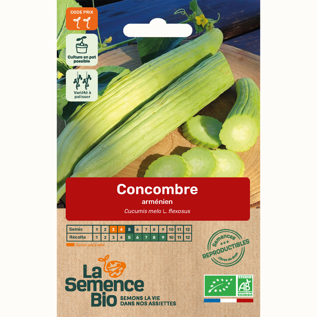 Descriptif : le concombre arménien produit de longs fruits cylindriques de 40 cm à 1 m, de couleur vert pâle et sans épine. Sa saveur est très douce, sucrée et jamais amère.