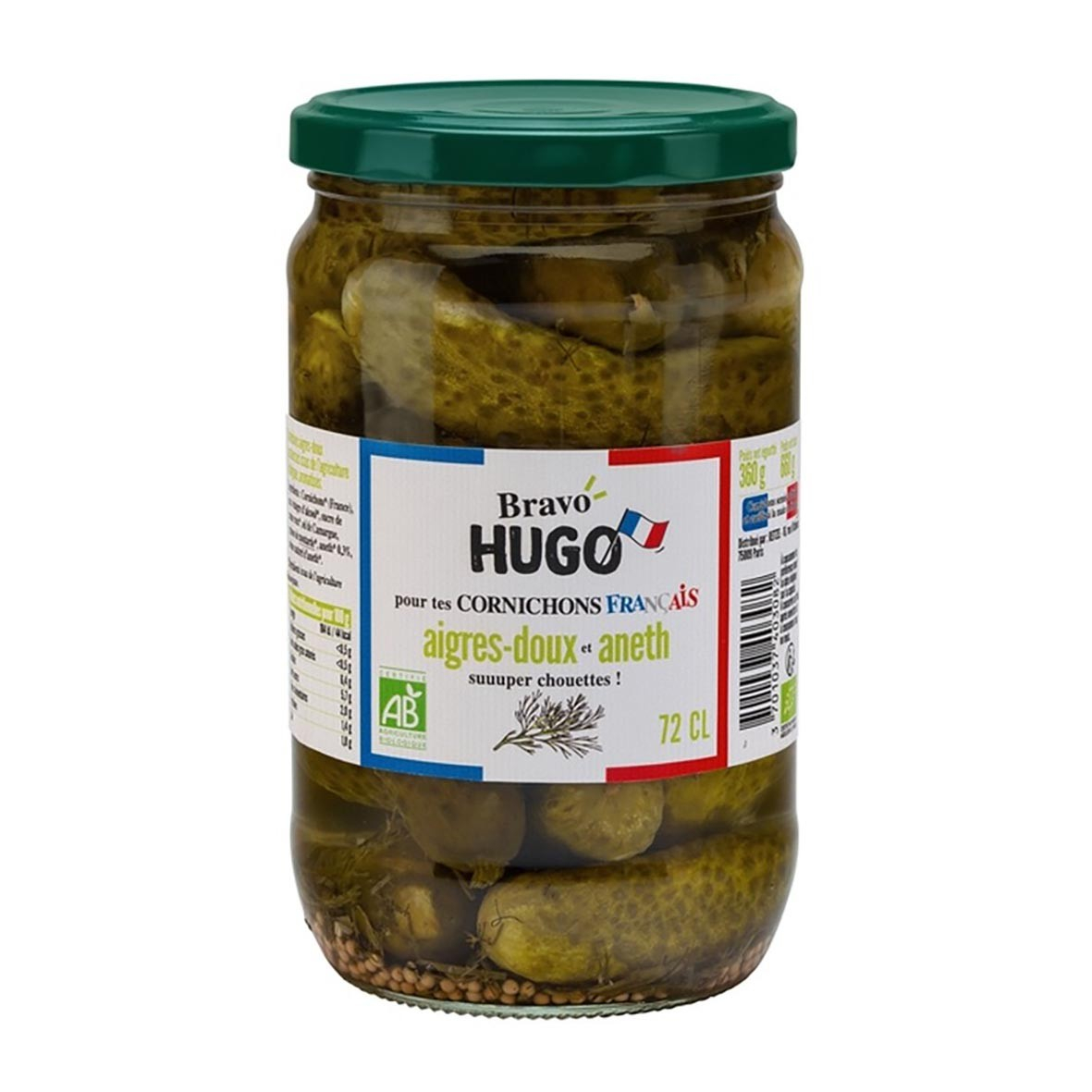 Découvrez ces délicieux cornichons français aigres-doux à l'aneth bio de la marque Bravo Hugo.