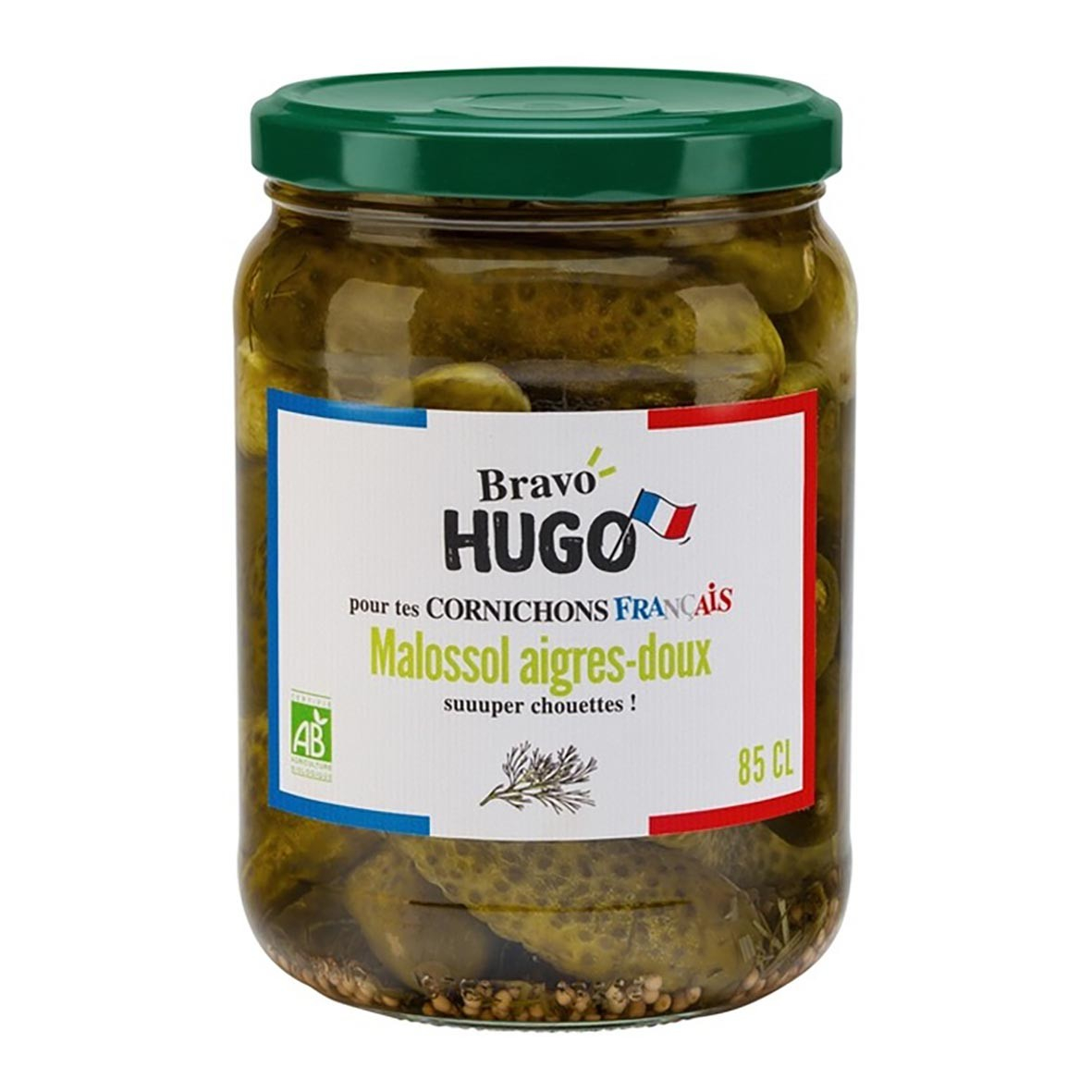 Découvrez ces délicieux cornichons malossol aigres-doux bio de la marque Bravo Hugo.