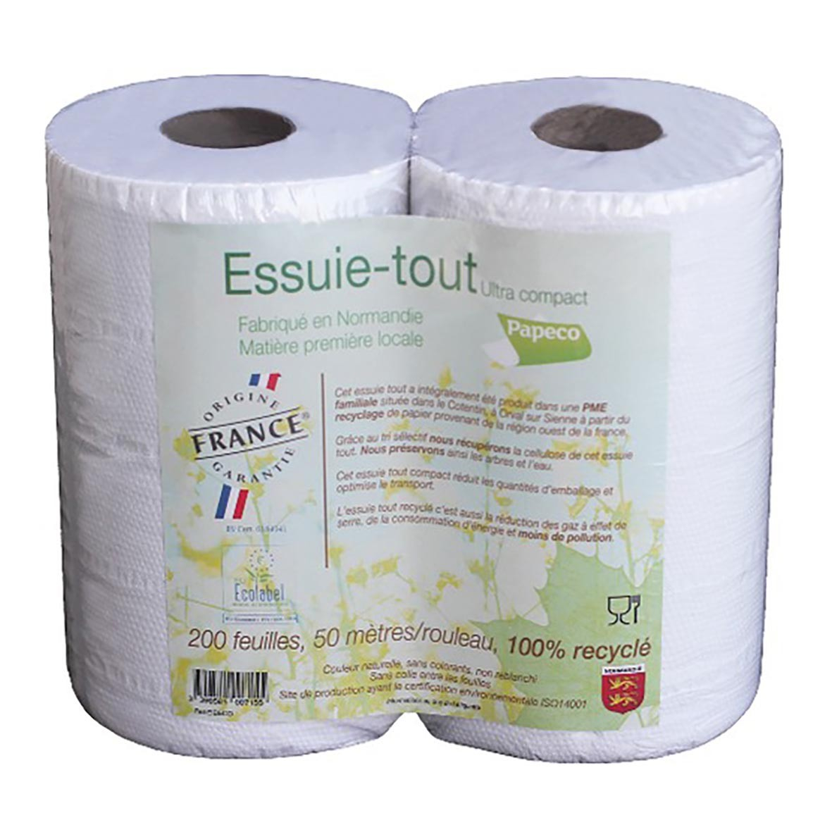 Découvrez l'essuie-tout blanc 100% recyclé, 200 feuilles Ecolabel de la marque Papeco.