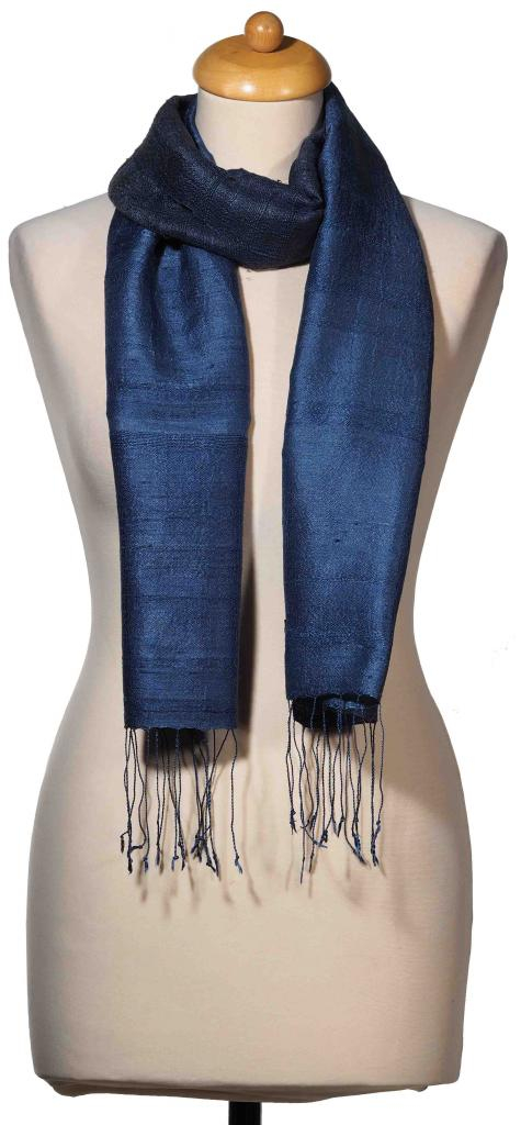 Foulard en soie tissé main Zoata. Mis en valeur grâce à ses subtiles nuances de bleu, le foulard en soie Zoata peut être porté aussi bien en journée qu’en soirée.