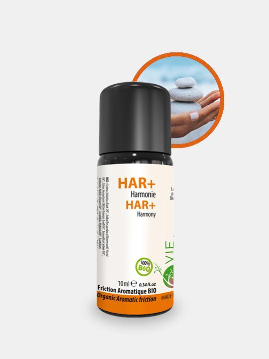 Pour la friction HAR+*, la formulation inclut notamment les huiles essentielles Bio de Camomille romaine*, Bois de Santal* et Rose de Damas*.