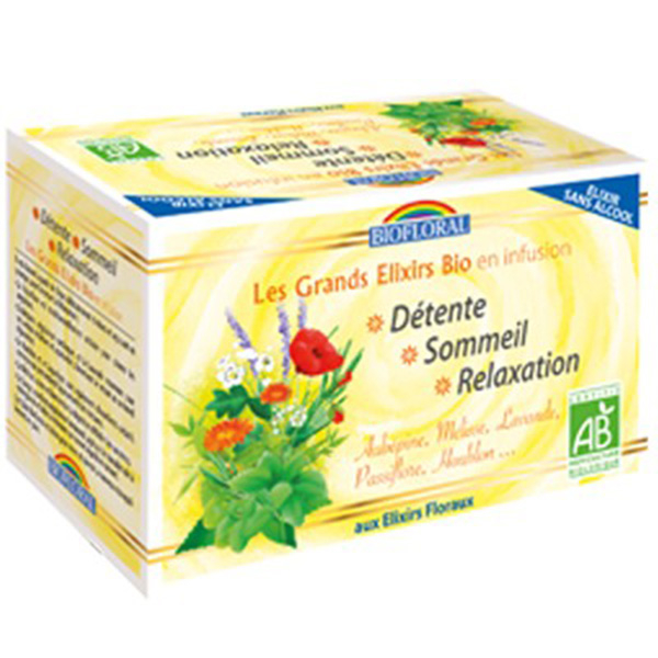 Fabrication artisanale selon des méthodes ancestrales. Infusion élaborée à partir des fleurs les plus efficaces pour favoriser la relaxation : la Passiflore, l’Aubépine et la Lavande sont traditionnellement utilisées pour leurs vertus apaisantes qui favorisent le retour du sommeil réparateur, le Houblon et le Coquelicot sont d’excellents sédatifs nerveux qui permettent l’apaisement des tensions, le Calendula, hypotenseur, vous procure bien-être et détente. Idéale pour les personnes ne souhaitant pas consommer d'alcool. Prendre 1 sachet-dose 3 fois/jour, de préférence avant ou après chaque repas, et sur 1 période de 28 jours (une lunaison complète). Ceci plusieurs fois dans l’année. Laissez infuser votre sachet dans de l’eau chaude durant 5 à 10 minutes. Vous pouvez ajouter du miel et/ou du lait selon votre convenance. Dans les montagnes d'Auvergne, au coeur d'une nature forte et pure, le Laboratoire Biofloral se consacre entièrement à la production de remèdes phyto-thérapeutiques et naturels. L'extraction des principes actifs est faite avec beaucoup de soin et de temps, permettant d'en extraire le maximum sans les altérer. Grâce à ces procédés très complexes, ces élixirs sont d'une grande pureté et efficacité : les principes actifs des extraits de plantes agissent rapidement sur l'organisme. Les élixirs floraux selon le Dr. Bach rééquilibrent les troubles émotionnels et les blocages profonds. Les essences spagyriques harmonisent les énergies vitales sur les plans physique, psychique et mental. La garantie qualité de Biofloral : plantes biologiques rigoureusement sélectionnées selon un CDC strict, contrôles rigoureux tout au long du process de fabrication pour assurer les propriétés organoleptiques et physico-chimique des plantes, contrôles pour tester l’absence de pesticides ou de tout autre élément chimique