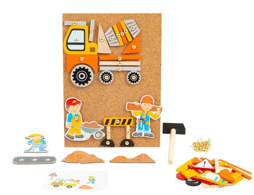 Équipé d'une plaque de liège, d'un marteau, de clous et de divers éléments en bois, ce jeu de marteau peut être utilisé pour créer de nombreux motifs sur le thème du chantier de construction.