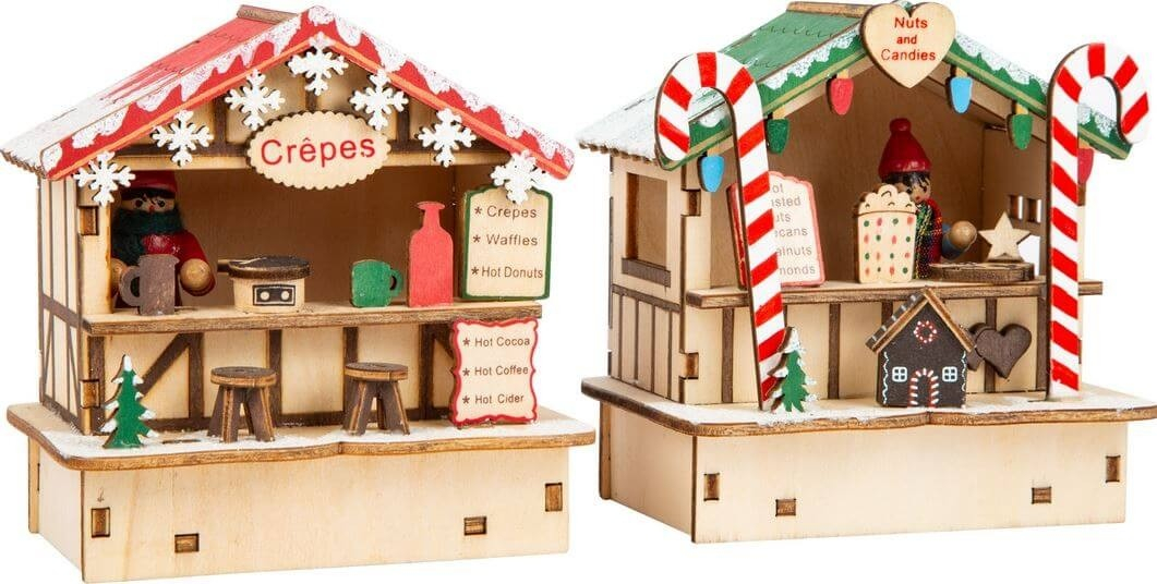 Lot de 2 cabanes en bois représentant les marchés de Noël avec leurs cabanes à crêpes et bonbons, joliment travaillées, pour apporter une touche personnelle à votre décoration.