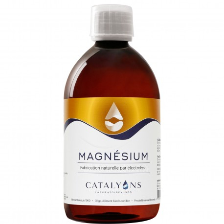 Le Magnésium des laboratoires Catalyons est un oligo-élément qui active plus de 300 enzymes assurant de nombreuses fonctions. Il contribue au maintien d'un métabolisme énergétique normal, au fonctionnement normal du système nerveux et à des fonctions psychologiques et musculaires normales.Il sera principalement utilisé en cas de crampes, d'insomnie, de fatigue et contribue également à la transmission nerveuse et à la relaxation musculaire. L'oligo élément magnésium peut être utilisé comme un anti-stress, indiqué dans les troubles nerveux, l'anxiété, l'hyperactivité, l'insomnie, la fatigue, la dépression ou l'épilepsie.Magnésium Catalyons est un complément alimentaire qui peut également être conseillé dans les cas de constipation chronique, spasmes digestifs, palpitations, crampes, spasmophilie, maux de tête, vertiges, ou encore hypertension. C'est également un anti-inflammatoire, qui stimule la formation d'anticorps.Contenance : Flacon de 500 ml.Conseils d'utilisationPrenez 1 à 3 bouchons de Magnésium Catalyons par jour 15 min avant le repas ou le soir au coucher. Agitez puis avalez sans diluer.CompositionIngrédients : Eau ultra-purifiée et dynamisée, citrate de Magnésium.Analyse nutritionnelle en Magnésium pour 3 bouchons : 56,1 mg soit 15% des AJR (Apports journaliers recommandés).Les Catalyons ne contiennent ni alcool, ni lactose, ni gluten, ni colorants de synthèse, ni parabens, ni benzoate, ni sulfites.CatalyonsCatalyons est une entreprise familiale forte de plus de 50 ans d'expérience. Raymond Valtat, fondateur et chercheur en physique-chimie, s'est inspiré des procédés physiques de la nature alors qu'il tentait en vain de trouver un remède pour sa femme atteinte d'un cancer du foie. Il a constaté qu'une fois dissous dans l'eau purifiée et dynamisée, les métaux se transforment en ions encore plus puissants que les ions naturels.Il dépose alors le brevet des "catalyons" signifiant catalyseurs ionisés, et commercialise des solutions ionisées pour permettre à chacun d'entre nous de rééquilibrer son corps en oligo-éléments. Parmi elle, on trouve l'argent colloïdal, les mélanges cuivre or argent ou encore manganèse cuivre. Aujourd'hui, ce sont ses petites filles ont repris le flambeau du laboratoire Catalyons.