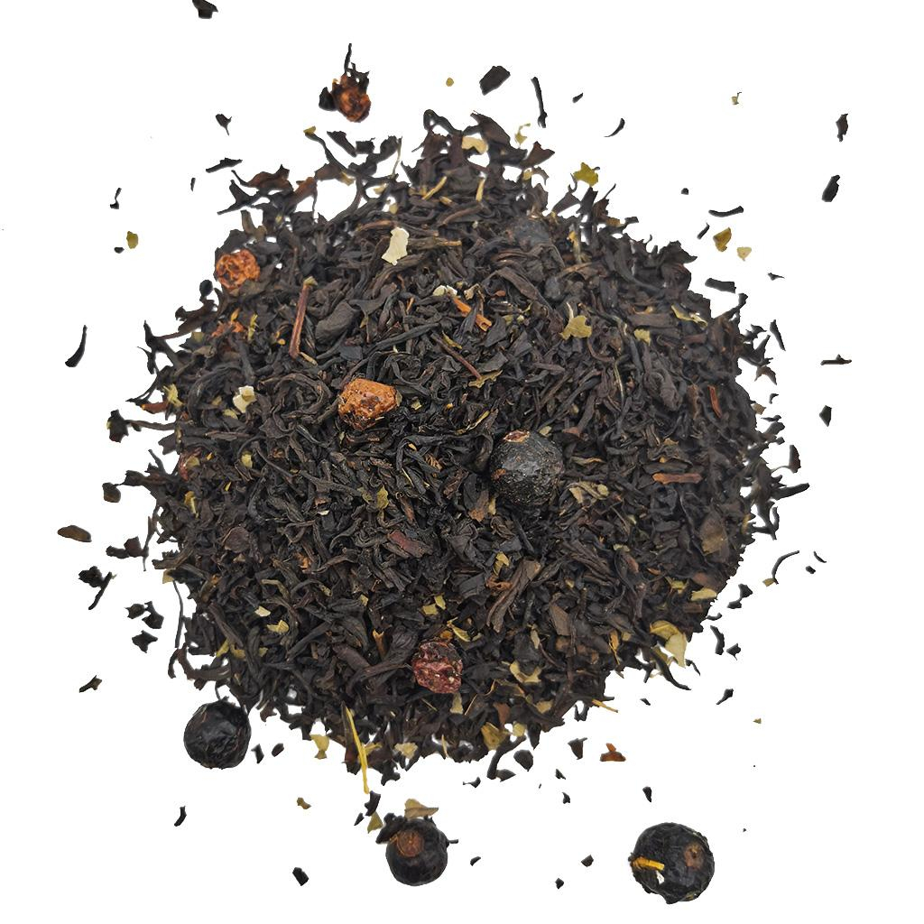 Thé noir Assam* - Inde du Sud*, arôme naturel, feuilles de mére*, groseille* (2%), cassis* (1%). *Issu de l'agriculture biologique