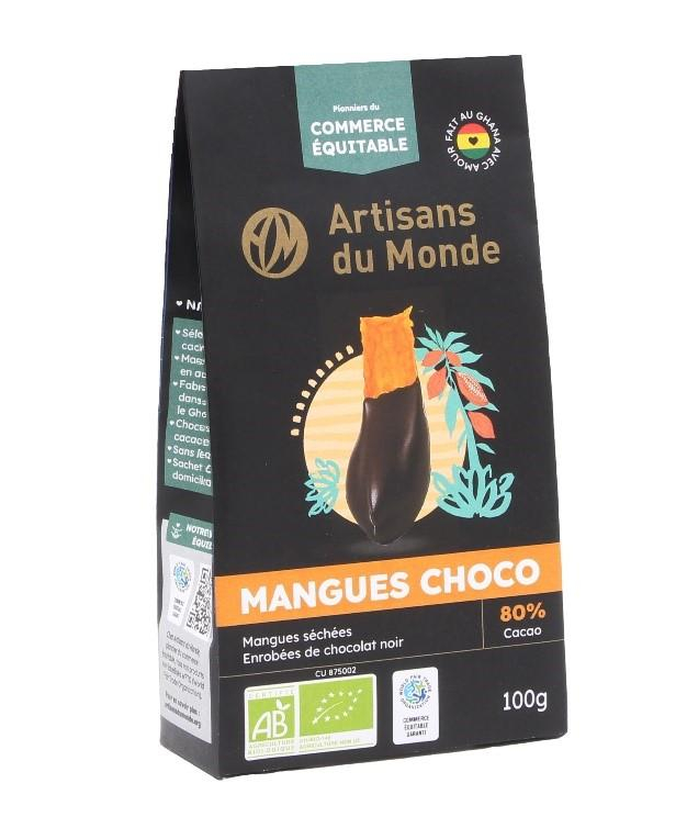 Mangues séchées enrobées de chocolat noir issues de l’agriculture biologique et du commerce équitable.
