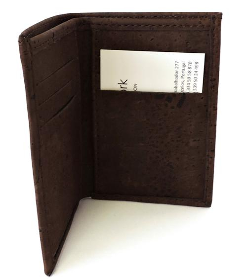 Mini Portefeuille unisexe fait en cuir végétal de liège. A l’intérieur il dispose de six fentes externes pour les cartes de crédit, cartes de visites, cartes de fidélités (3 fentes sur chaque côté). Sur chaque côté, derrière des fentes pour les carte de crédit, il y a un compartiment pour les documents. Sur toute la longueur il y a un compartiment à billets.