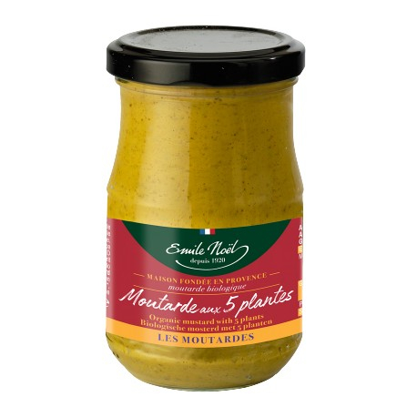La Moutarde aux 5 plantes d'Emile Noël est aromatisée au basilic, romarin, thym, marjolaine et sarriette pour lui offrir une belle intensité et encore plus de caractère.
