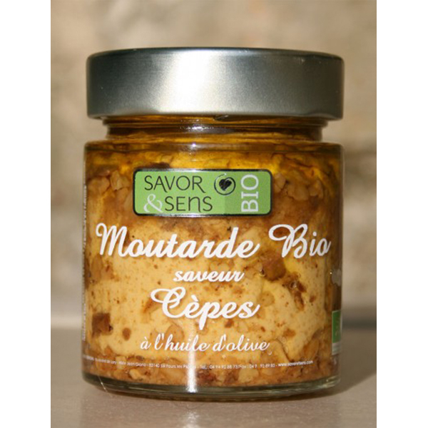 Moutarde bio saveur cèpe - Une moutarde originale grâce à son brevet déposé. Les ingrédients sont figés sur la paroi grâce à l'huile d'olive mais pas mélangés à la moutarde ! Cette moutarde savoureuse aux saveurs douces accompagnera parfaitement vos viandes et poissons !
