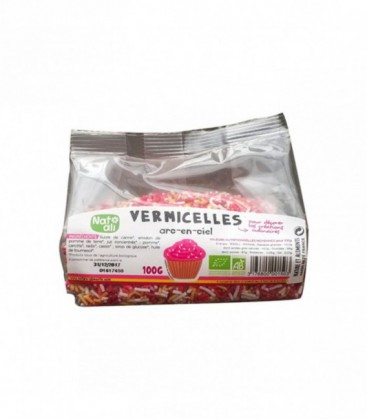 Vermicelles bio Arc-en-ciel de la marque Nat-Ali Sachet de vermicelles de couleur rose, jaune et blanche. Idéal pour décorer vos créations culinaires : pâtisseries, cupcakes, gâteaux, etc