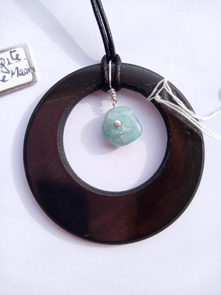 Ce pendentif de Shungite est un cercle évidé où j'ai inséré une perle brute d'Aigue-Marine sur un fil d'argent. Monté sur cordon réglable, c'est un pendentif très féminin. Son nom : Cercle dans le Cercle. La Synergie Shungite/Aigue-Marine renforce l'ouverture vers de nouveaux horizons.