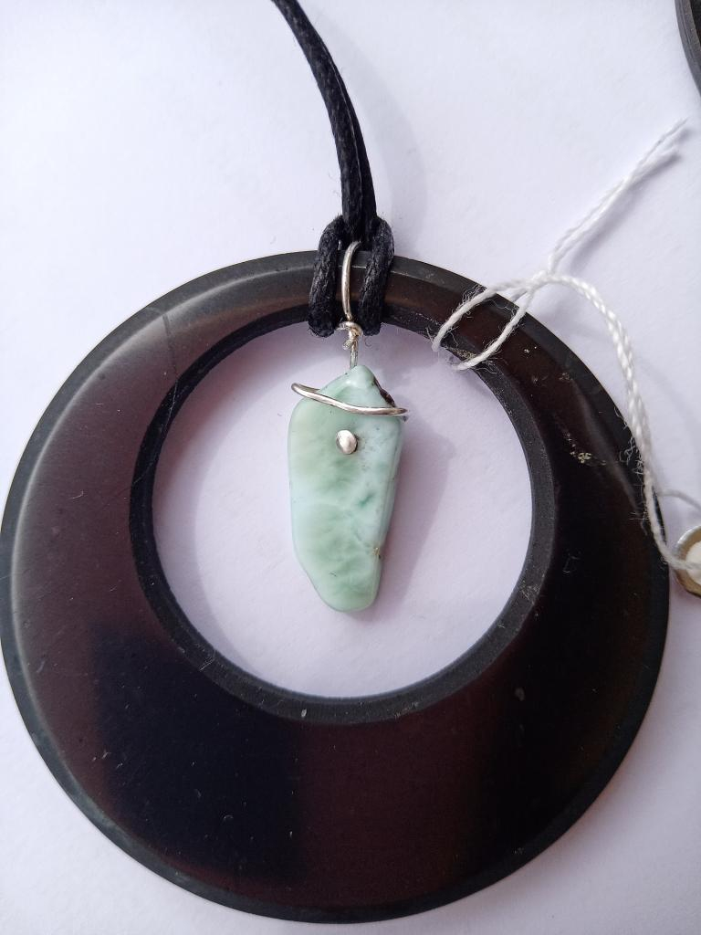 Ce pendentif de Shungite est un cercle évidé où j'ai inséré une perle de Larimar sur un fil d'argent. Monté sur cordon réglable, c'est un pendentif très féminin. Son nom : Cercle dans le Cercle. La Synergie Shungite/Larimar active la confiance en Soi.