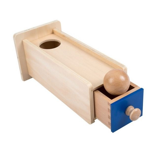Cette jolie boite en bois possède un long tiroir avec un gros bouton de préhension pour l'ouvrir ou le fermer ce qui permet à l'enfant d'aller chercher la balle qu'il vient de faire tomber.