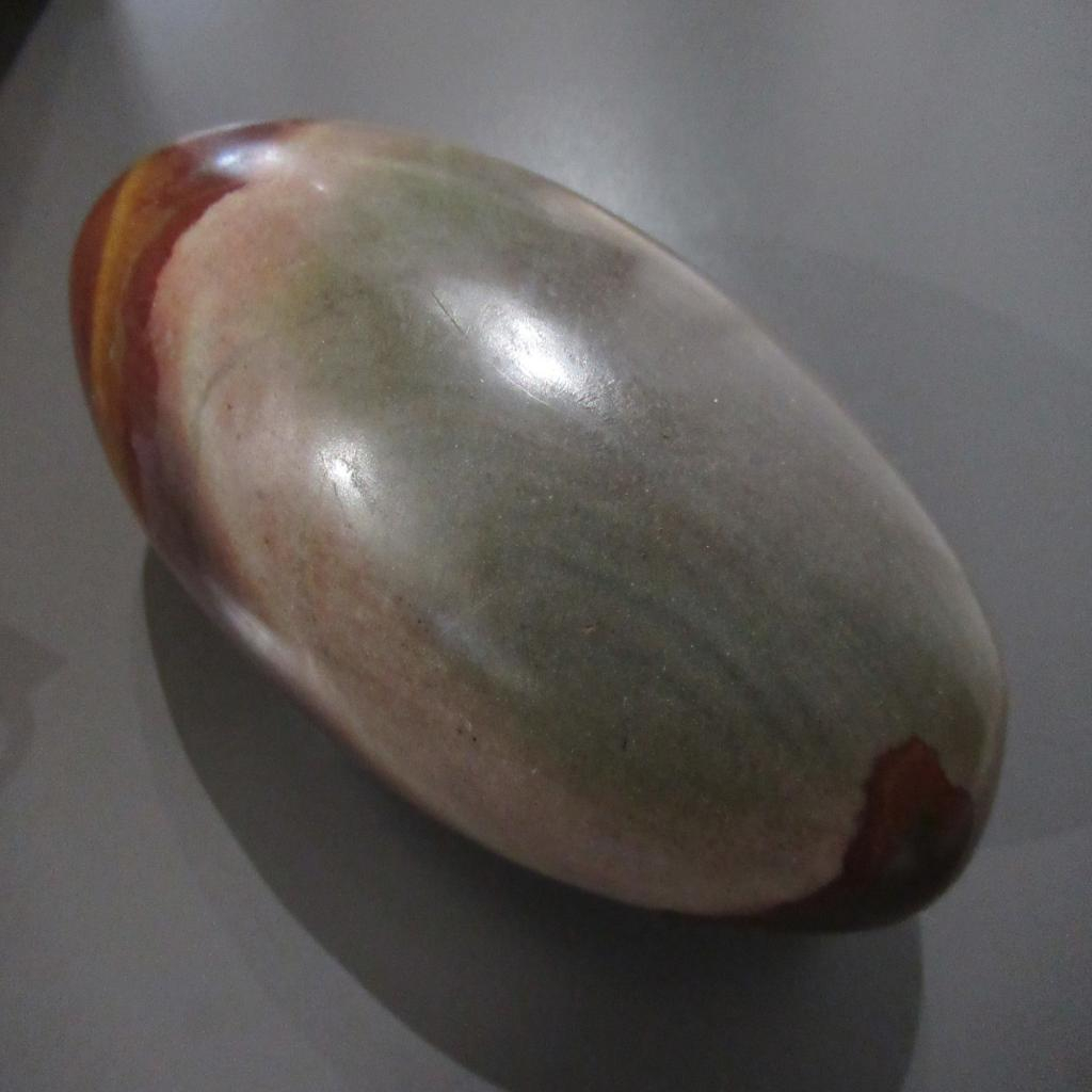 18.5 cm de long, cette pierre de Shiva présente une tache verte due à la fossilisation d'herbes dans la rivière, pierre rare.