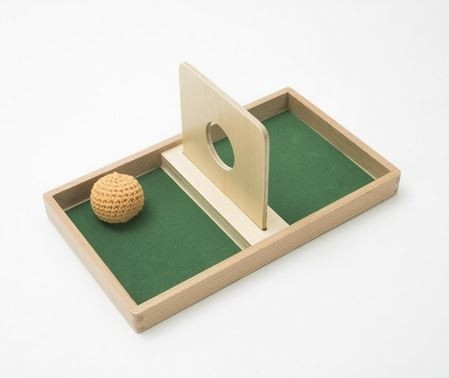 L'enfant insert la balle dans le trou prévu à cet effet, et la balle "disparait" alors derrière le "mur" de séparation.