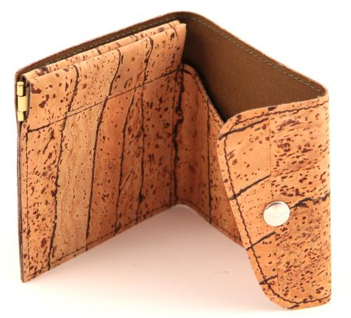 Portefeuille unisexe en tissu naturel de liège avec fermeture à pression. Il dispose d’un porte-monnaie et d’un compartiment pour les billets. L'intérieur est doublé en coton.