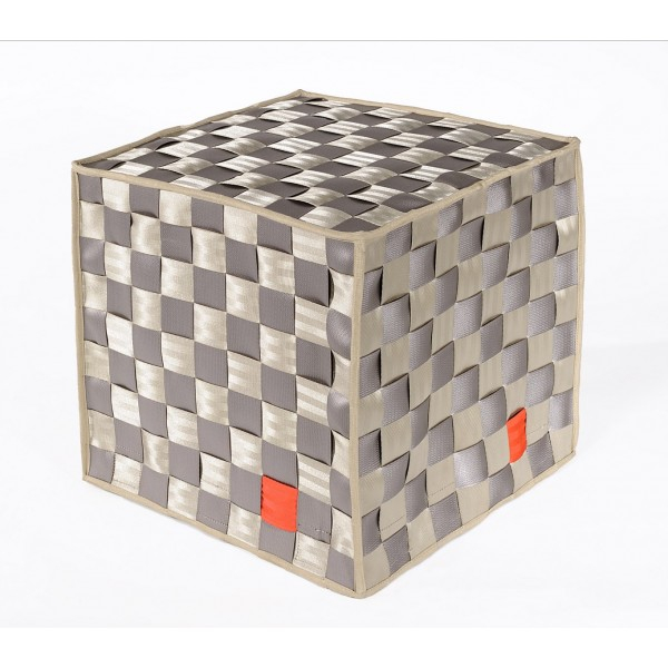 Pouf Square carré en ceintures de sécurité recyclées Extérieur en ceintures de sécurité recylées beige,gris clair et rouge. Structure externe scratchée sur structure métallique. Assise rembourrée de mousse sur bois.Fabrication par une ONG qui lutte contre la pauvreté en Inde32 x 32 x 32 cm