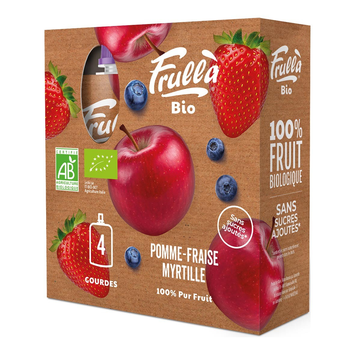 La purée de pommes, fraises et myrtilles bio de la marque Frullà est composée à 100% de fruits biologiques.