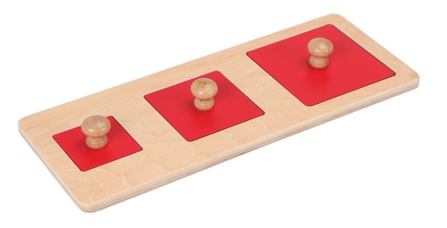 Puzzle géométrique d'encastrement avec 3 carrés rouges de 3 tailles différentes. Ce puzzle permet de :
