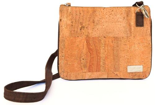 Sac bandoulière pour les dames, fait en tissu naturel de liège, composé de deux couleurs harmonieuses : naturel et marron. Il peut se porter sur l'épaule ou croisé en travers du corps grâce à une bandoulière ajustable en longueur par une boucle métallique. Deux crochets métalliques de chaque côté de la sangle permettent l’attache au sac.