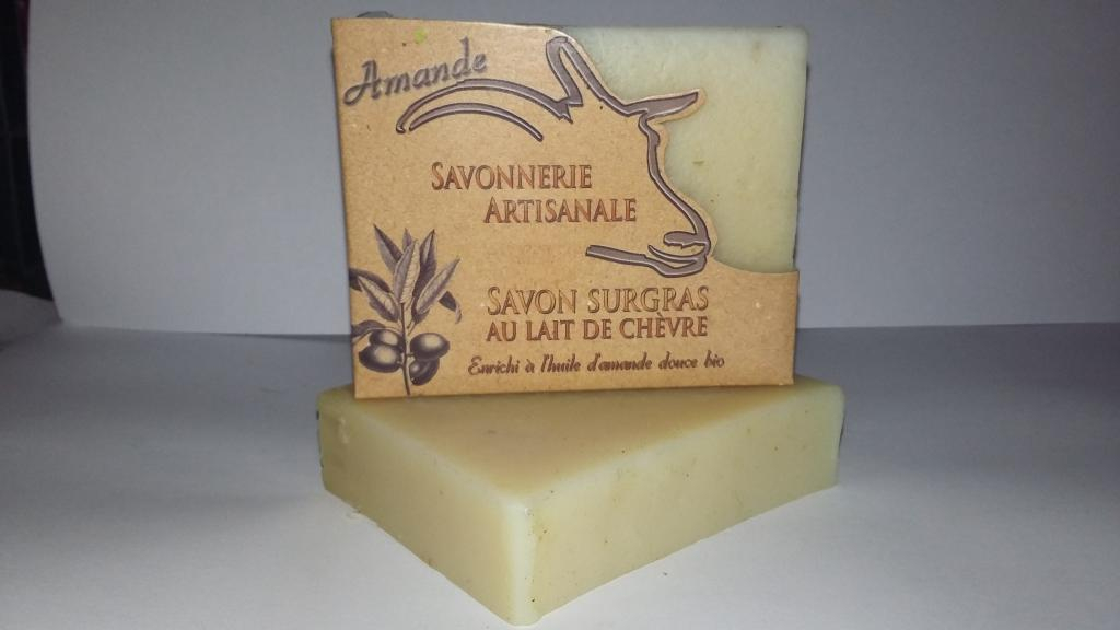 Savon amande au lait de chèvre fabriqué à la ferme avec le lait de mes chèvres et huiles végétales et essentielles bio. Tous mes savons sont fabriqués artisanalement à la ferme selon la méthode ancestrale du savon fait à froid. Cette technique très ancienne permet d’obtenir un savon très doux pour la peau, qui ne la dessèche pas et qui permet de conserver toute la valeur nourrissante des huiles utilisées. Fini la peau qui tiraille aprés la douche ! Savon amande 100G : savon surgras à 9 % enrichi à l’huile d’amande douce et sans huile essentielle Huiles utilisées : huile d’olive bio, huile de coco bio, beurre de cacao bio, huile de ricin bio , huile d’amande douce sans colorants artificiels, ni conservateurs et sans huile de palme Utilisation : bien faire sécher sur un porte savon aprés usage pour prolonger la vie de votre savon naturel