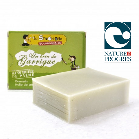 L’huile essentielle de romarin qui compose ce savon est reconnaissable par son odeur forte et camphrée. Produite par ce petit arbre vert, cette huile a des vertus antiseptiques, stimulantes et tonifiantes. C’est un excellent allié pour les peaux grasses et les épidermes stressés.