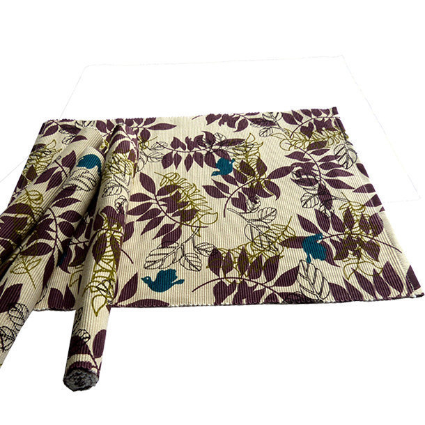 Les sets de table sont faciles à utiliser et changent en un tour de main  l’aspect de votre table. Cette impression végétale  s’harmonisera avec de la vaisselle unie dans les camaïeux de taupe et beige. Avez-vous vu l’oiseau caché dans les feuilles d’une belle couleur bleu ? Pourquoi ne pas choisir alors des assiettes bleues pour assortir au set ?