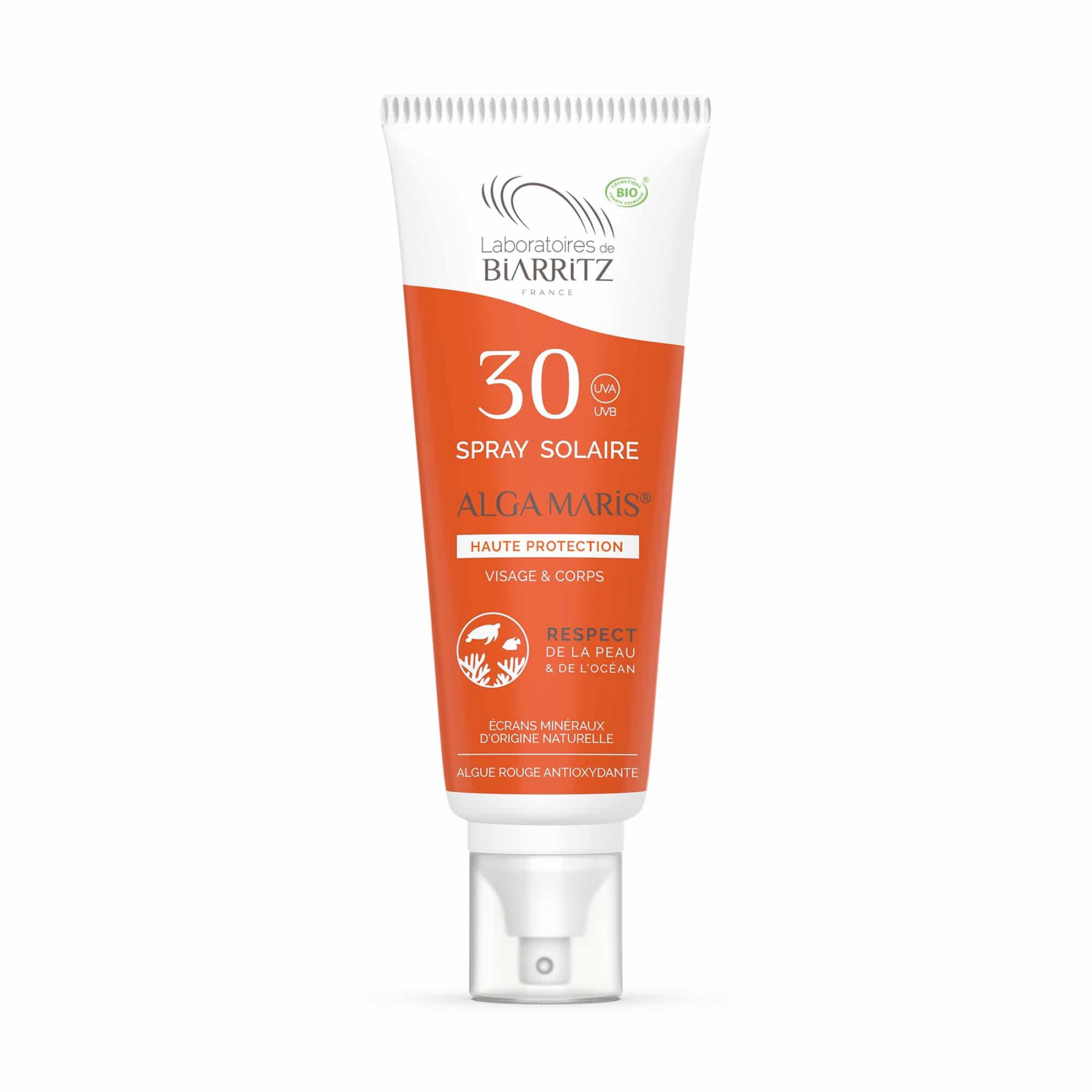 Le spray solaire SPF30 assure une haute protection naturelle grâce à ses écrans minéraux anti-UVA/UVB et à son extrait breveté d'algue rouge, Alga-Gorria® , puissant antioxydant qui neutralise les radicaux libres pour prévenir les dommages cellulaires et le vieillissement cutané induits par le rayonnement solaire.