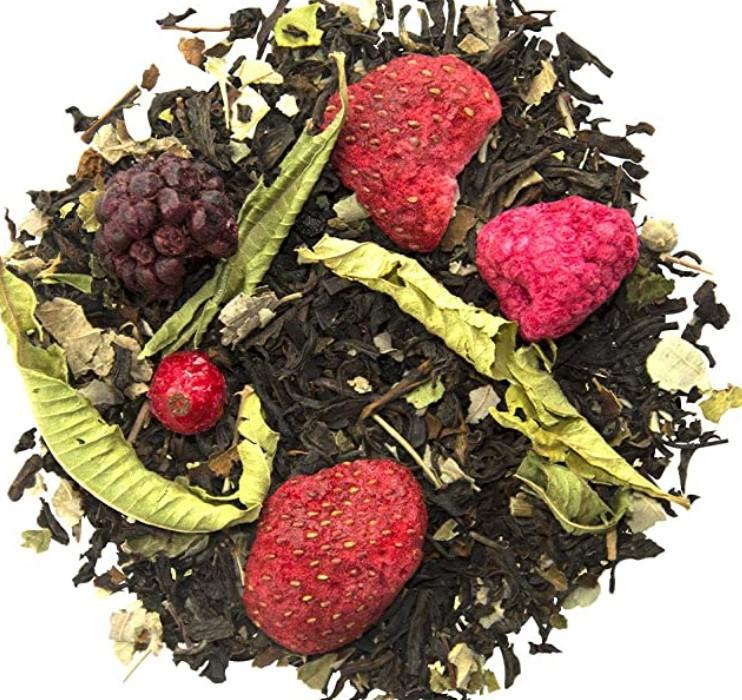 Thé noir Assam*, -Inde du Sud*, feuilles de mûre*, arôme naturel, verveine*, raisin (raisin, huile végétale)*, baie de sureau*, framboise*, mûre (2%)*, fraise*, cassis*, groseille*. *Issu de l‘agriculture biologique