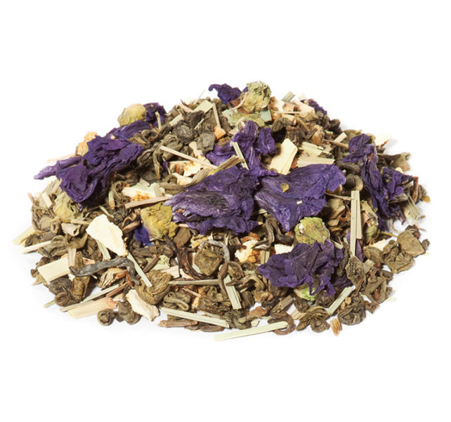 Composition : Thé vert China Gunpowder* (69%), citronnelle* (14%), maté vert* (6%), arôme naturel, thé blanc Mao Feng*, thé noir Golden Yunnan OP*, écorces de citron*, mauve*, prêle*, dent-de-lion*, thé vert Matcha*, spirulina*, guarana*.