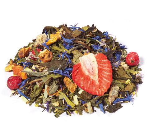 Composition : Thé vert de Chine Sencha*, thé noir Assam*, -Inde du Sud*, thé blanc Mao Feng*, arôme naturel, fraise*, canneberge*, pétales de rose*, fleurs de bleuet*.